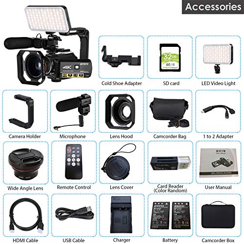 【Cosa ottieni】 1 * fotocamera 4K, 2 * batterie ricaricabili agli ioni di litio, 1 * microfono esterno, 1 * luce video a LED, 1 * obiettivo macro, 1 * obiettivo grandangolare, 1 * paraluce, 1 * Supporto per fotocamera, 1 * cavo HDMI, 1 * adattatore per slitta, adattatore 1to2, 1 * cavo di ricarica, 1 * telecomando, 1 * cavo USB, 1 * manuale dell’utente, Scheda SD da 1 * 32 GB. Il prodotto è valido per uso domestico / amatoriale, non per uso professionale.